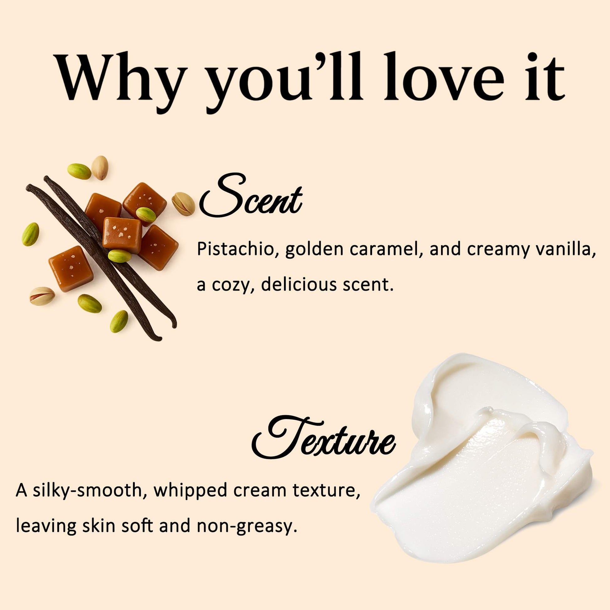 A soft, creamy blend of vanilla, pistachio, and caramel, with a hint of sweetness that feels comforting and joy. Smooth and cozy — like dessert melting into your skin.